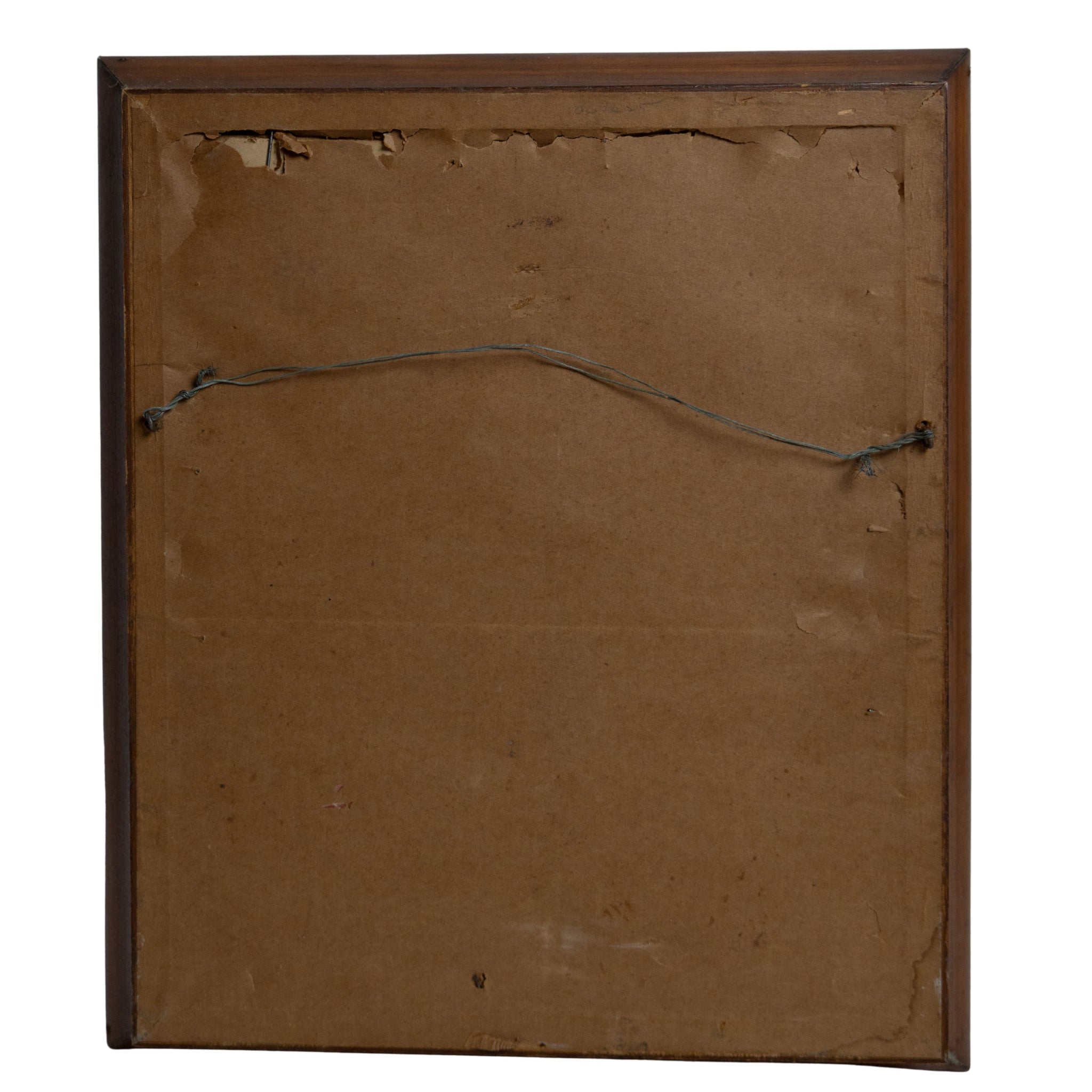 Set in a wooden frame with gold trim, the piece measures approximately 12.5” wide by 14.5” tall. The backing shows wear consistent with age, adding to its vintage charm.