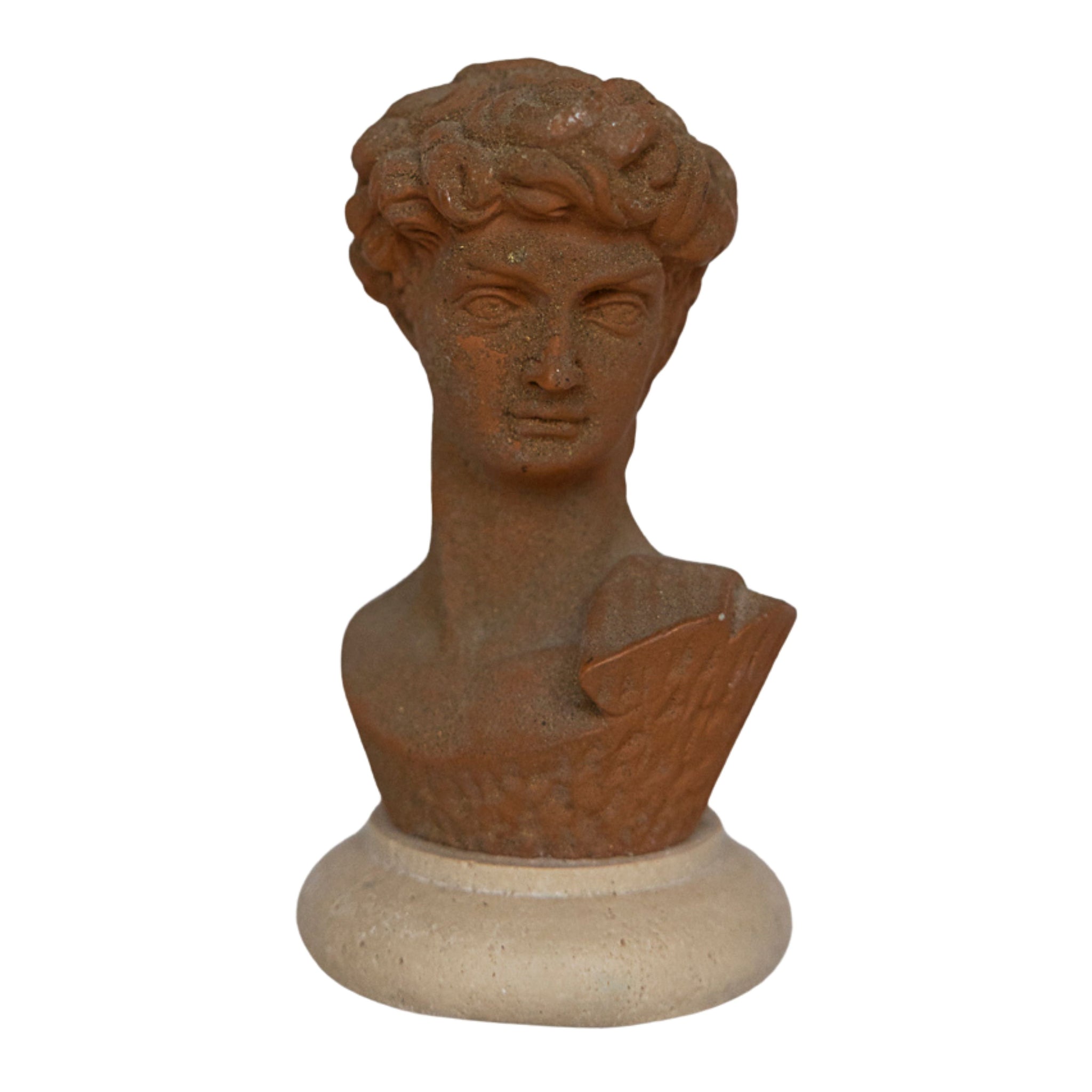 This petite classical-style bust features a softly modeled figure mounted on a solid travertine base, giving it both contrast and substance despite its small scale. The warm terracotta-toned surface and timeworn detailing evoke traditional European study casts and atelier models.