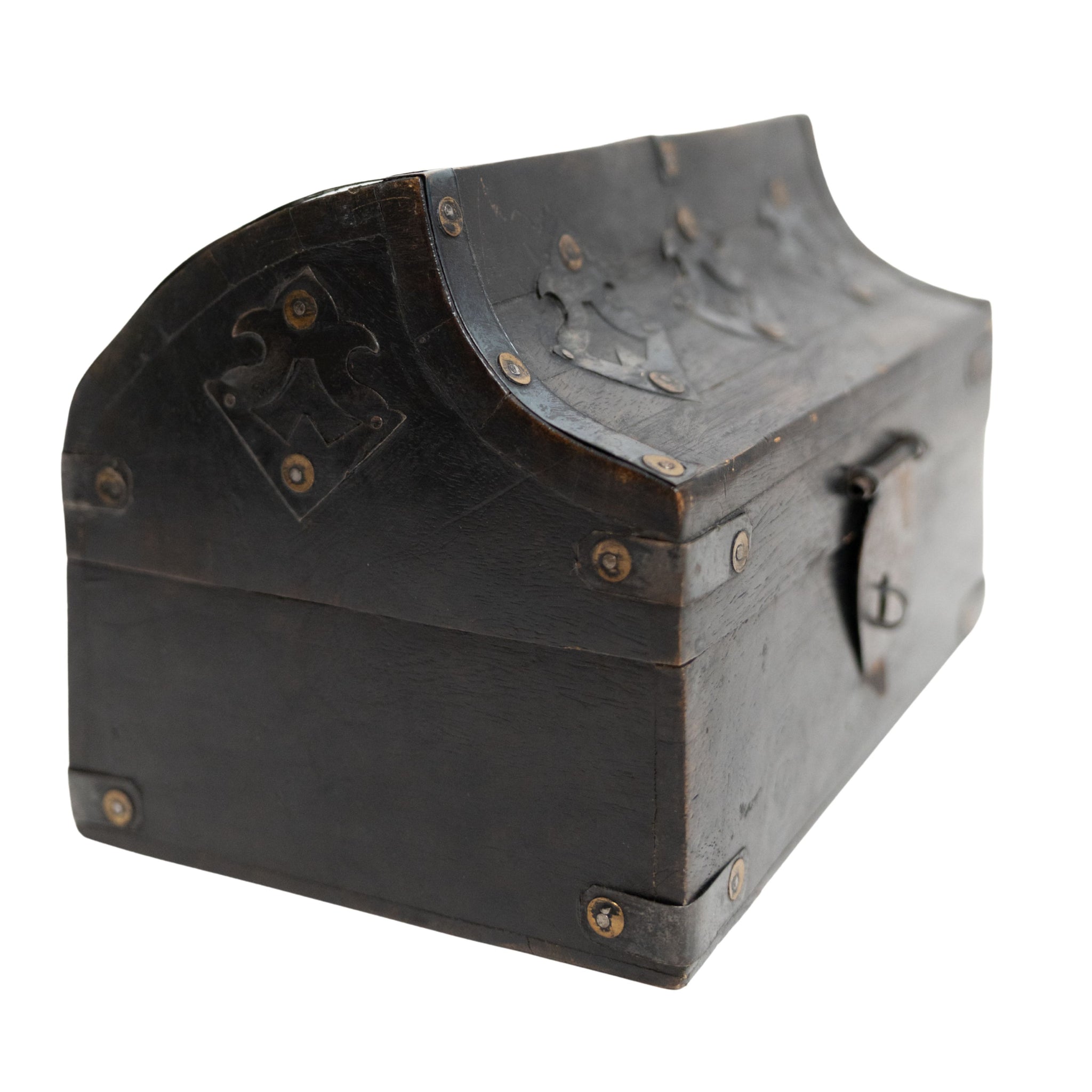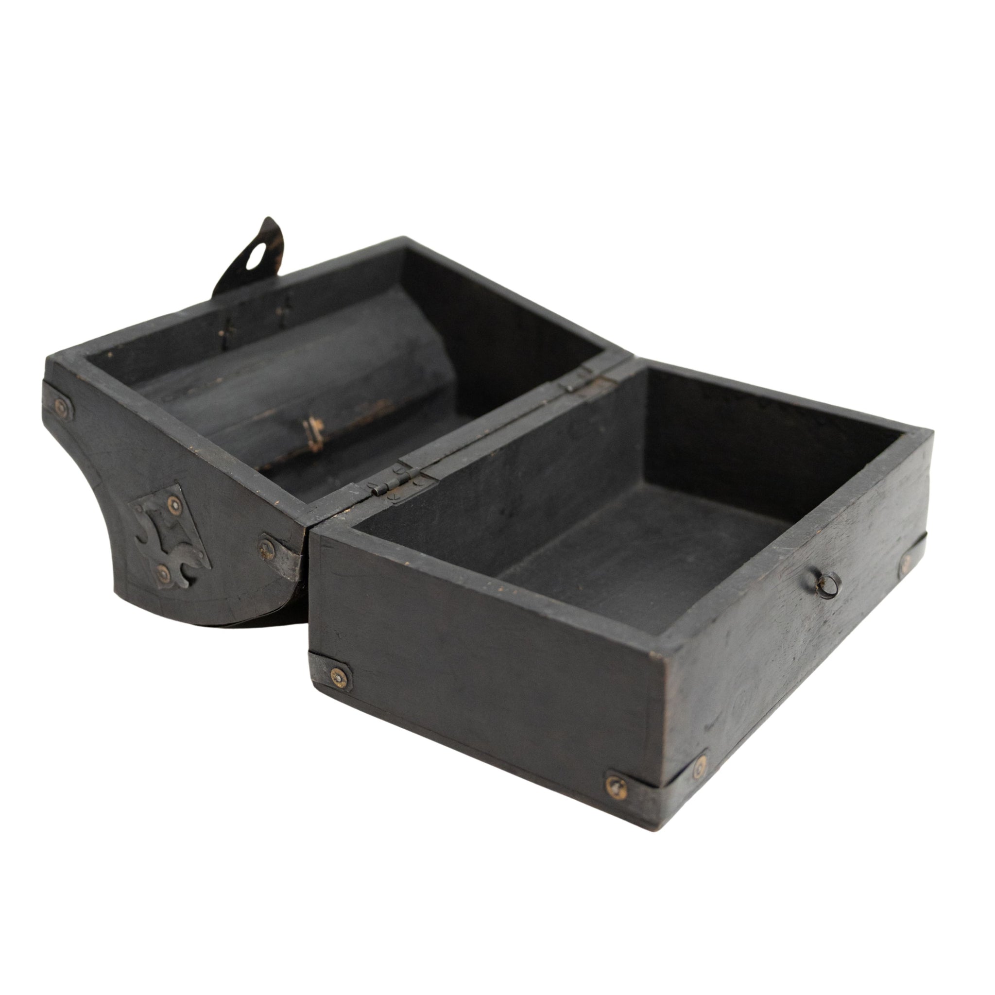 This primitive vintage wooden lockbox features a dark, distressed finish with rustic metal accents and a curved lid — reminiscent of old-world storage chests. Handcrafted with charming imperfections, it’s perfect for storing keepsakes, jewelry, or small trinkets while adding character to your décor.