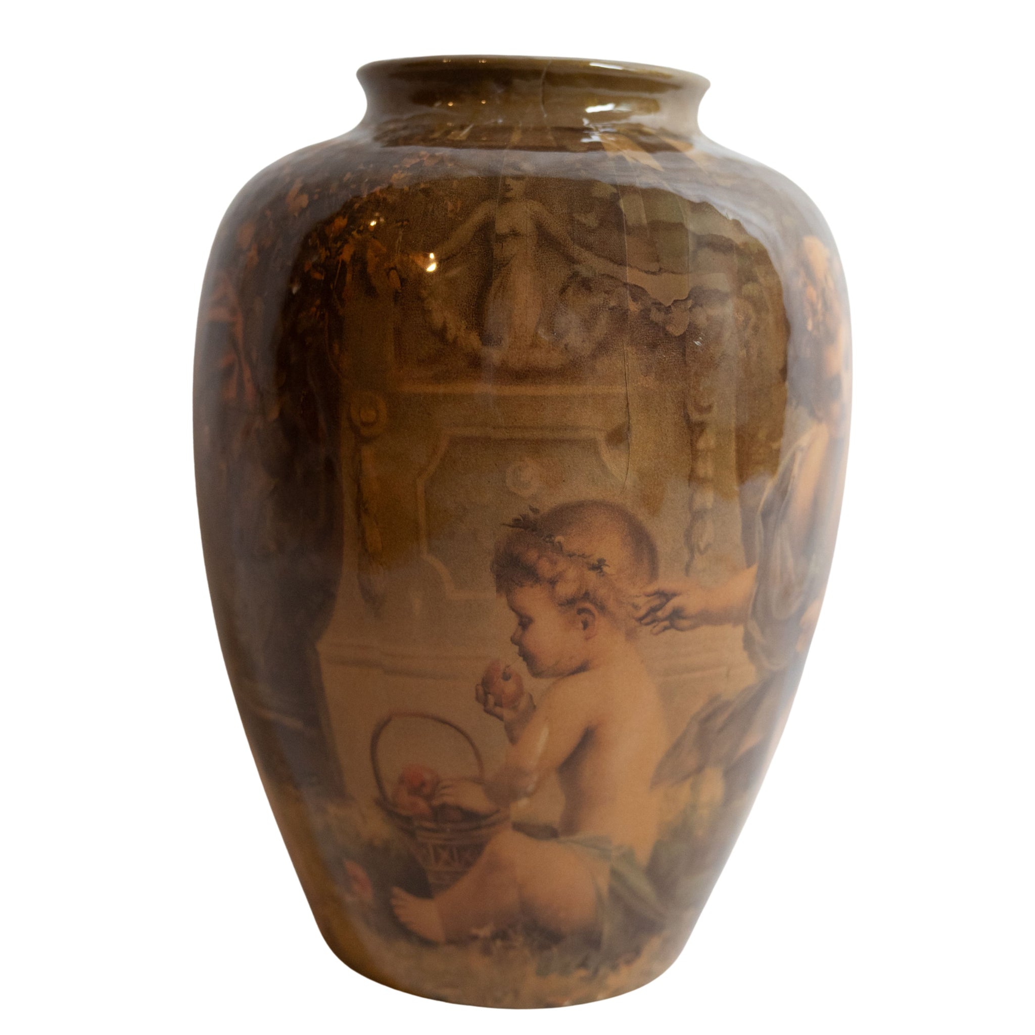 This vintage ceramic vase features classic Renaissance-inspired artwork of cherubs and figures in soft, romantic tones, wrapped around its curved form. The glossy finish enhances the intricate, painterly imagery that evokes antique European style.