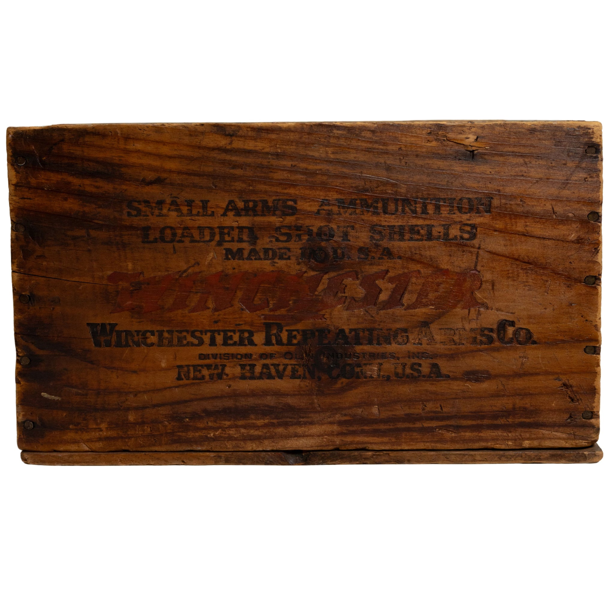This vintage Winchester wooden crate was originally used for small arms ammunition and loaded shot shells, proudly marked “Made in U.S.A.” The rich patina, darkened lettering, and dovetail-style corner details add character and history. Perfect for storage, displays, or adding a rustic, primitive touch to any space.